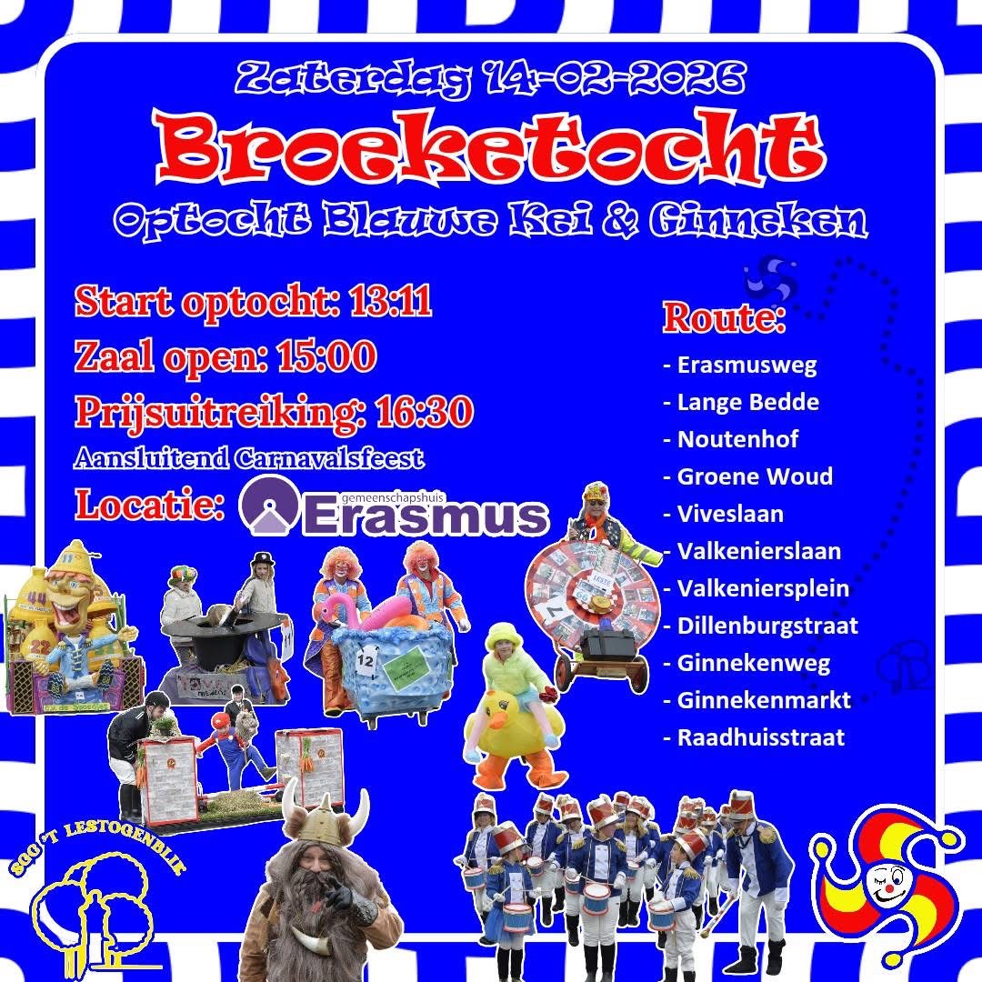 B r o e k e t o c h t 2 0 2 6 Zaterdag 14 februari trekt de bonte stoet weer door de wijken Blauwe Kei en Ginneken. 💙💛❤️ De Broeketocht vertrekt om 13:11u vanaf gemeenschapshuis Erasmus en eindigt op de Ginnekenmarkt. Aansluitend zal om 16:30u de prijsuitreiking plaats vinden in gemeenschapshuis Erasmus....